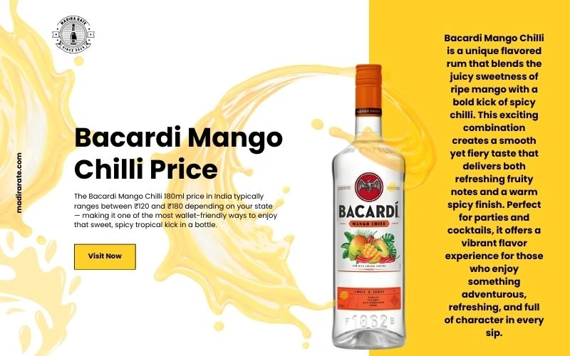 The Bacardi Mango Chilli 180ml price varies by state but generally falls between ₹120 and ₹185 across India. Delhi and Kolkata tend to be on the lower end, while Assam and UP may be slightly higher due to excise duties.